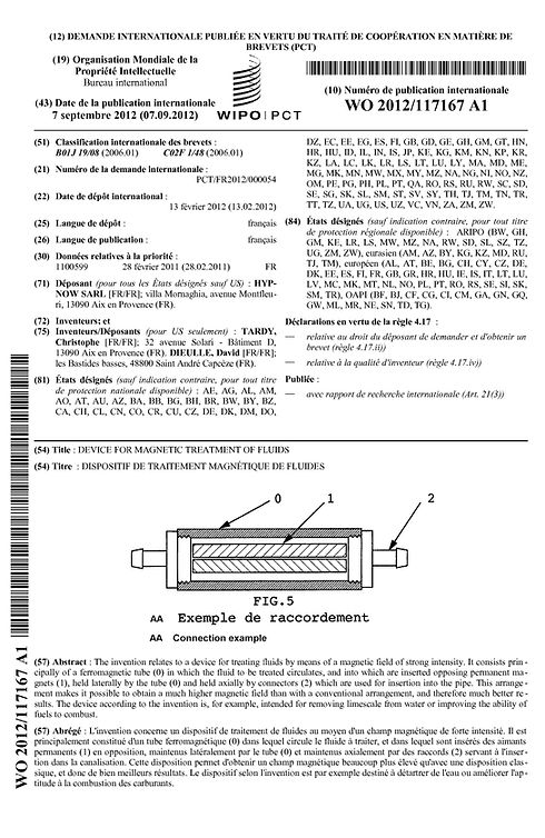 The patent WO2012/117167 A1 concerns the device MAGN-US for the magnetic treatment of fluids, in particular fuels used in internal combustion engines.
